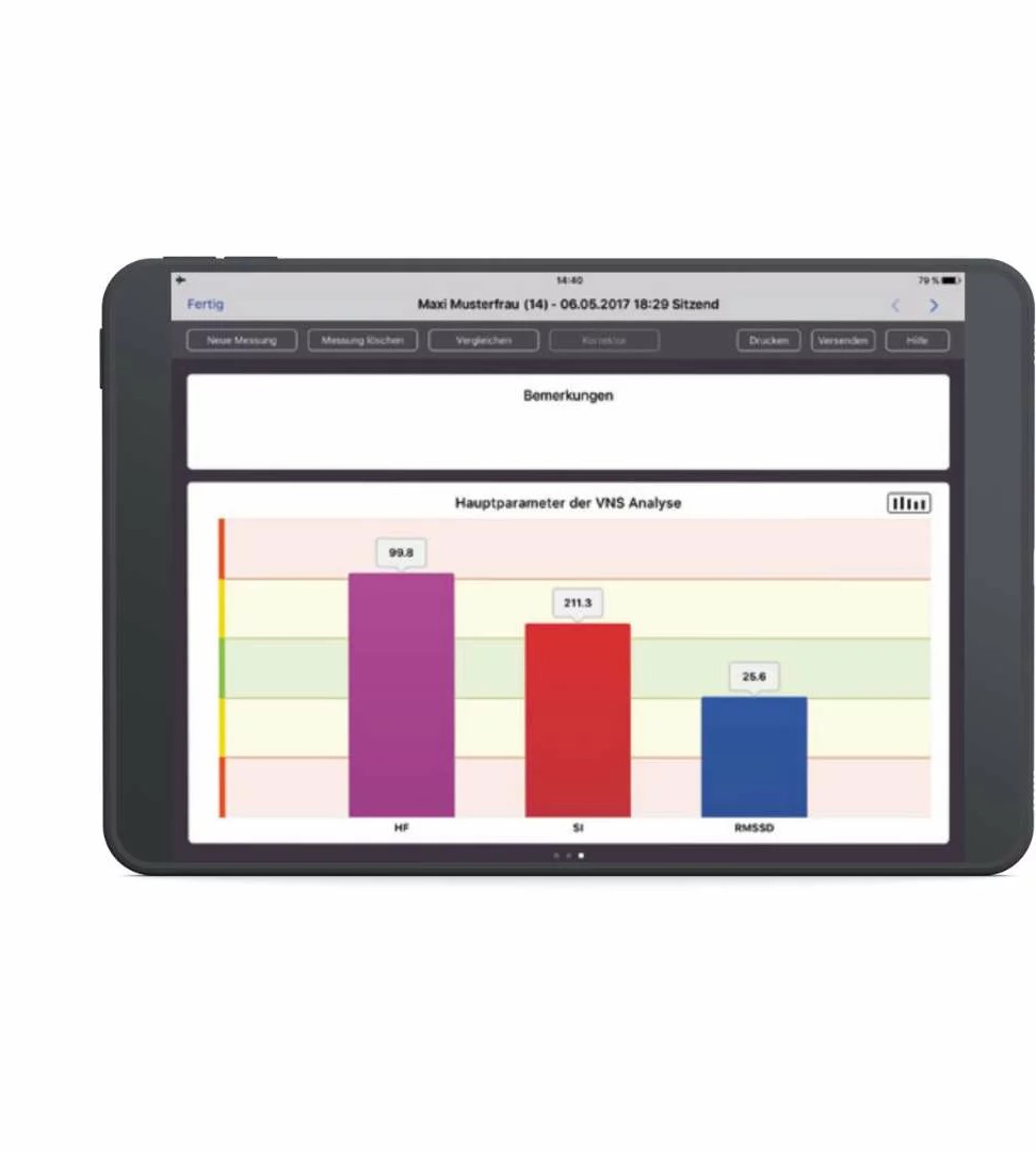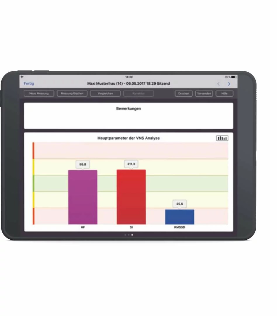 Die VNS Analyse funktioniert über die Auswertung vegetativer Parameter, die in zwei Hauptkategorien erfasst werden: HRV-basierte Kennwerte wie Rhythmogramm und Streudiagramm sowie spezifische VNS Parameter wie der RMSSD, Stressindex und der Alpha-1-Wert (DFA 1). Diese ermöglichen eine umfassende Beurteilung der vegetativen Regulation. Ein integriertes kardiorespiratorisches Biofeedback-System unterstützt den Patienten während der Messung und fördert die Stimulation des Parasympathikus. Die Ergebnisse werden unmittelbar nach der Messung verständlich dargestellt, was die therapeutische Kommunikation erleichtert und die Patienten-Compliance fördert.